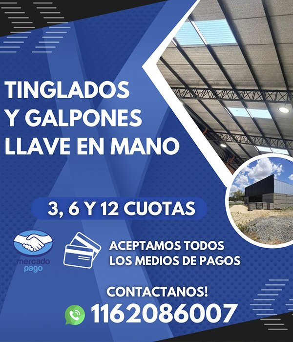 En Tinglados del Sur realizamos trabajos de tinglados y galpones llave en mano, diseñados para satisfacer todas tus necesidades de almacenamiento y espacio de trabajo/hogar. Nuestros servicios y productos destacan por su calidad, durabilidad y versatilidad. Ya sea que necesites un almacén industrial, un taller de producción o cualquier otro tipo de estructura, nosotros tenemos la solución perfecta para vos. Y lo mejor de todo es que ofrecemos opciones de financiamiento flexibles para que puedas obtener el espacio que necesitas sin afectar tu flujo de efectivo.